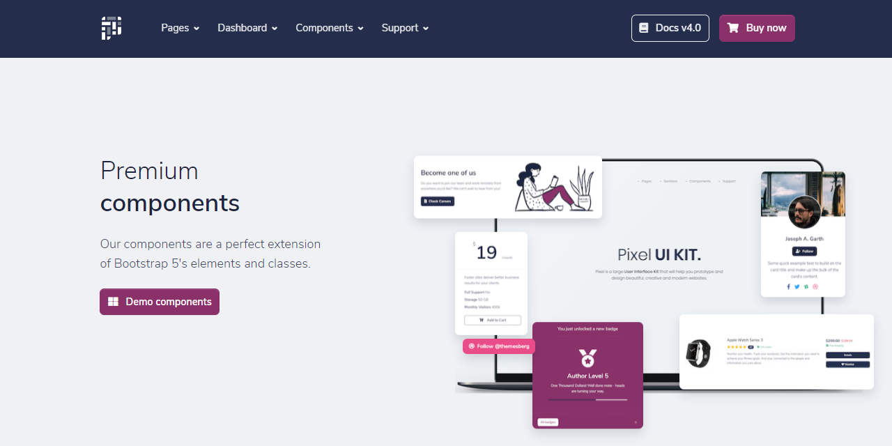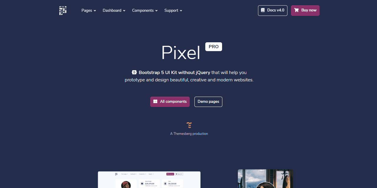 Pixel Pro is a premium Bootstrap 5 UI Kit without jQuery featuring over 1000 components, 50+ sections, and 35 example pages - provided by Themesberg.
