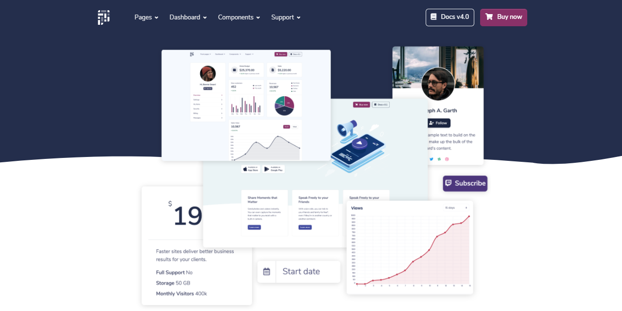 1000+ Components - Buttons, timelines, blog cards, profile cards, tables, accordions... you name it and we have it. Our components are a perfect extension of Bootstrap 4 so you will find it very easy to work with our code if you're familiar with their class names and styles. Furthermore, we've made sure to that all components are well documented.